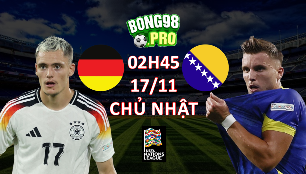 Nhận định bóng đá BONG98.PRO Đức vs Bosnia (02h45 ngày 17/11): Chỉ cần 1 điểm trước Bosnia – Đức sẽ chính thức khép lại chiến dịch vòng loại với ngôi đầu bảng A3. Với lợi thế sân nhà, thầy trò Julian Nagelsmann được kỳ vọng sẽ hoàn thành nhiệm vụ này một cách suôn sẻ