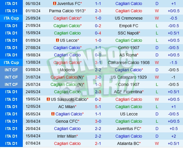 Thành tích gần đây của Cagliari