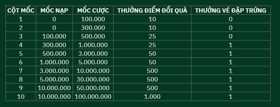 3. Đặt cược đạt các mốc sự kiện trong thời gian quy định sẽ nhận được những phần quà tương ứng bao